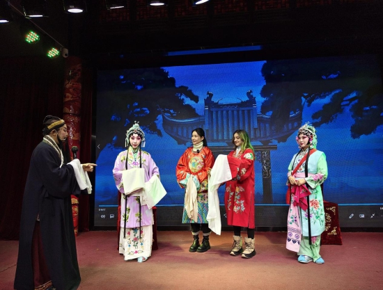 餐厅前部就是一方戏台,台上响起皮黄之声。两位京剧演员踏着台步登场,专业的京剧腔引得全场注目、拍手称好。水袖翻飞间,来自美联社的Dan Sandoval放下了筷子,专注地用相机拍摄这一中国传统艺术。美国自媒体博主于中美被邀请上台互动,在现场老师的指导下穿上戏服,甩袖踱步,引得台下连连鼓掌。“美食与艺术的结合,让文化变得更容易感受。”一位外国媒体记者感叹道。