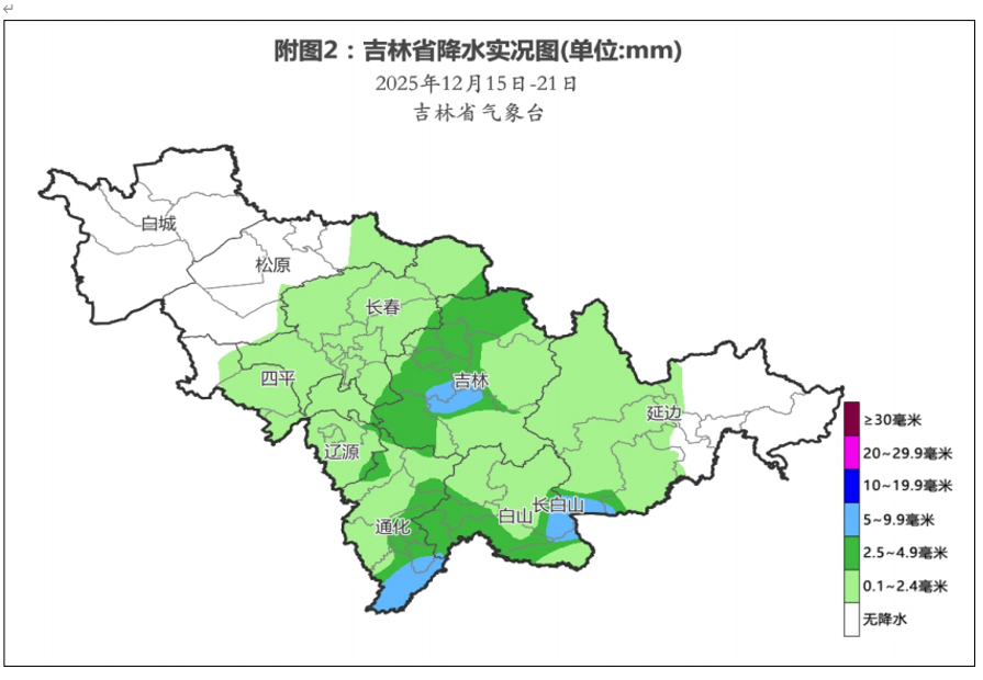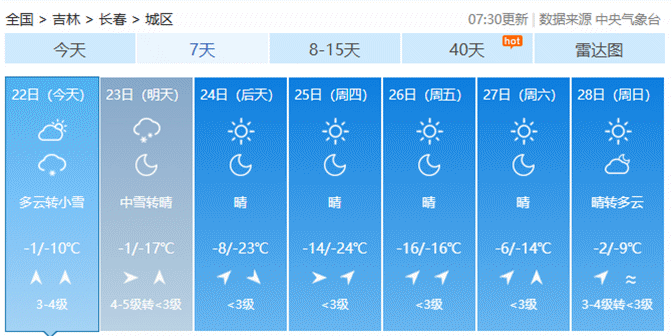 22日, 白城、松原、长春、 四平、辽源、吉林北部(吉林市区、舒兰、蛟河)、通化西部(梅河、柳河、通化县)有小雪;