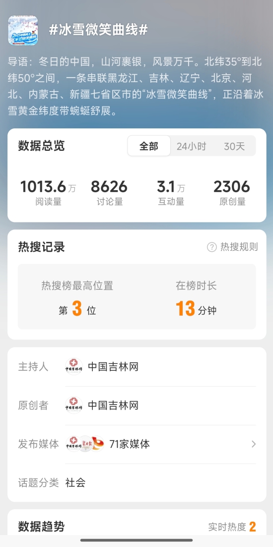12月26日,由中国吉林网主持的#冰雪微笑曲线#微博话题热度飙升,阅读量成功突破1000万,最高跻身热搜第三名,成为全网关注的冰雪热词。