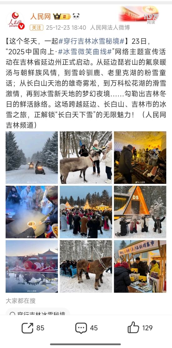 12月23日,由中央网信办网络传播局指导,吉林、北京、河北、内蒙古、辽宁、新疆等6省(自治区、直辖市)党委网信办联合主办的“2025中国向上·冰雪微笑曲线”网络主题宣传活动在吉林省延边州正式启动。活动相关话题迅速引发关注,点燃了全国网友对冰雪旅游的热情。话题之下,吉林冰雪产业的升级蝶变成为热议焦点:滑雪场设施扩容提质、特色冰雪产品焕新亮相、“冰雪假期”激活文旅市场等鲜活内容,通过网言网语持续发酵,让“冷资源”变“热经济”的吉林实践深入人心。