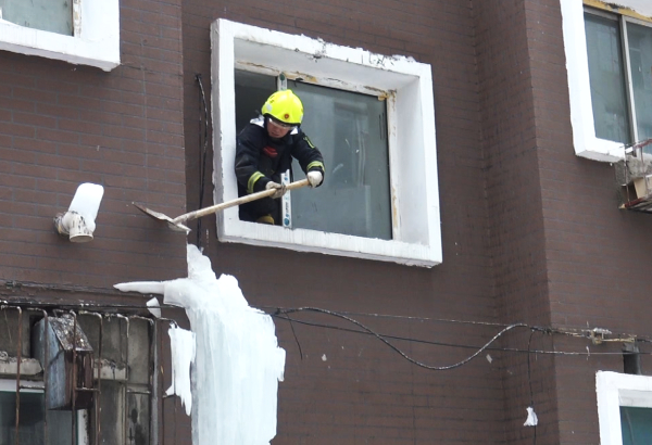 经过侦查, 现场是居民楼楼道口上方两层到三层位置有个大冰溜,随时有可能坠落,威胁进出楼道的居民安全。消防人员系上安全绳,爬到三楼和二楼窗口,用钩镰枪、撬棍、铁锹等工具对悬挂在外的“冰溜子”一点一片进行清除,同时,楼下队员实时进行警戒,防止击碎的冰块砸伤行人。经过消防人员近一个多小时的不懈努力,对存在安全隐患的“冰溜子”进行了清除。