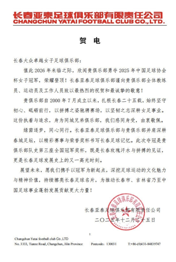 无独有偶,长春大众卓越女足的同城“兄弟”亚泰足球俱乐部也在其夺冠后,发来贺电。