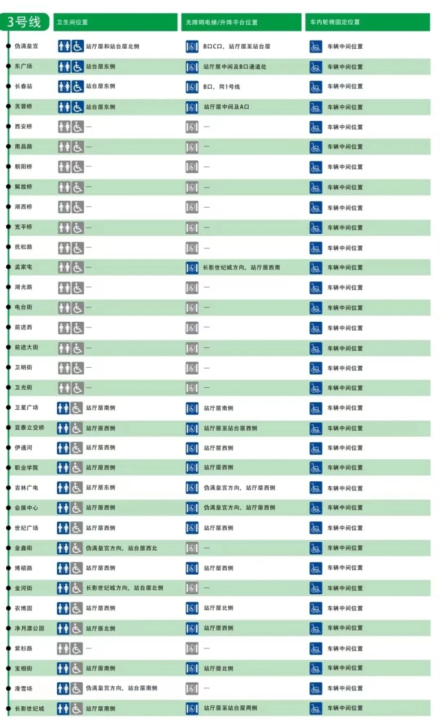 记者统计发现,长春轨道交通3号线全程34站,其中从西安桥站至卫光街站连续14站点缺少公共卫生间设施,市民如有需求可优先选择芙蓉桥、卫星广场或换乘站解放桥等设有公共卫生间的站点;也可以在宽平桥、朝阳桥等站点出站,选择站外距离较近的公共厕所。