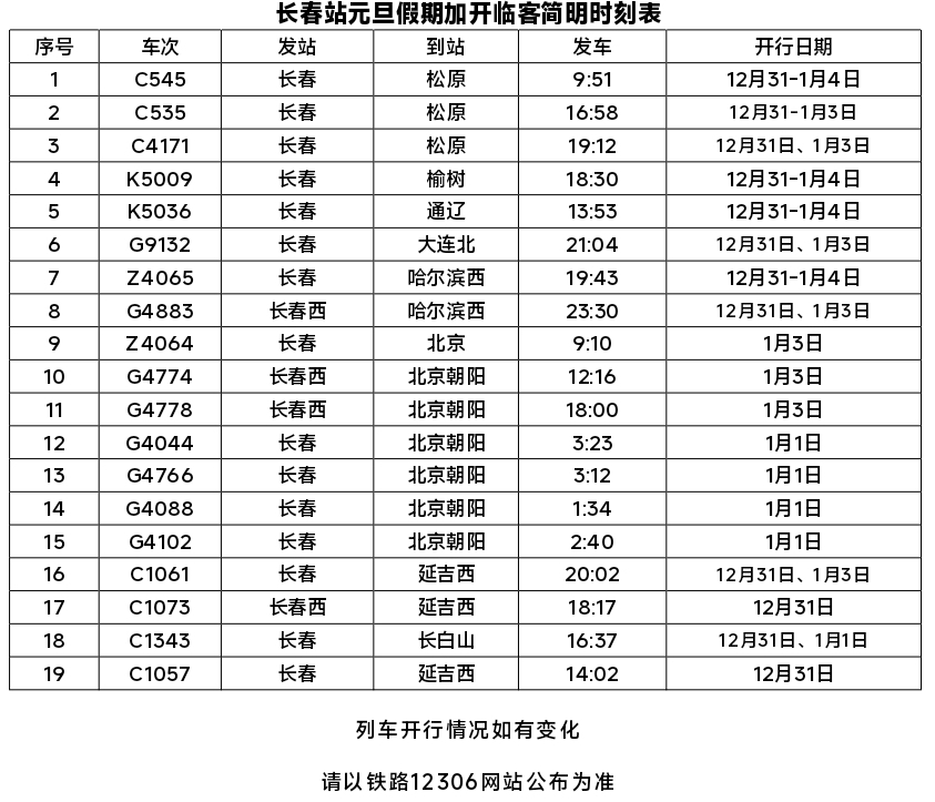 元旦假期以学生流、探亲流、旅游流为主,客流主要集中在北京、大连、哈尔滨以及松原、延吉、白城等方向。为保障节假日期间旅客顺利出行,长春站采取加开临时旅客列车,动车组重联、普速客车加挂等方式增加运能,共加开临时旅客列车19列,最大限度满足旅客出行需求。自入冬以来,“冰雪游”热度持续攀升,为满足节假日期间旅客到哈尔滨游玩需求,长春站日均开行哈尔滨方向旅客列车113列,为旅客创造更加便利的出行条件。