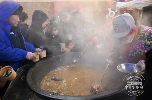 而另一处场景此时也正升腾着最具烟火气的温暖。在街区中央广场,一口铸铁巨锅早已热气腾腾。锅里炖煮的是来自石头口门水库的新鲜活鱼,配以吉林本地的特色食材。下午四点半开炖,浓郁的香气已弥漫半个街区。人们在零下十几度的环境中围坐在一起,锅边的笑声此起彼伏。