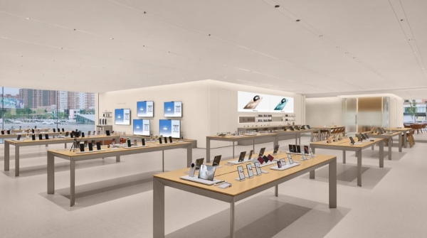 门店设计深度萃取吉林省标志性自然景观——长白山天池的美学灵感,将蓝色天池水、白色浮石与积雪的纯净色调融入空间肌理,搭配横向连续、纵向通透的外立面设计,层间无阻隔的布局让1470㎡的双层空间尽显“敞亮”质感。空间规划遵循“1+8+N+车”全场景生态逻辑,科学划分智能手机、智能穿戴、智慧办公、全屋智能及智选车等功能区域,13张体验桌与装机桌错落分布,搭配VIP洽谈室等配套空间,让不同年龄段、不同需求的消费者都能便捷感受万物互联的魅力。 省内首家3D裸眼大屏成为门店视觉焦点,超萌憨憨IP形象呈现,裸眼3D技术带来强烈视觉冲击,一亮相便成为长春新晋网红打卡地。店内细节处处彰显匠心:KV延展设计的饮品杯、手提袋印刻长白山纹路与“OH,敞亮!”标识,香薰片融入南湖公园、净月潭等吉林地标元素,搭配小苍兰、蓝风铃等清新气味,让科技空间满溢人文温度,每一处都传递着华为对品质与体验的极致追求。