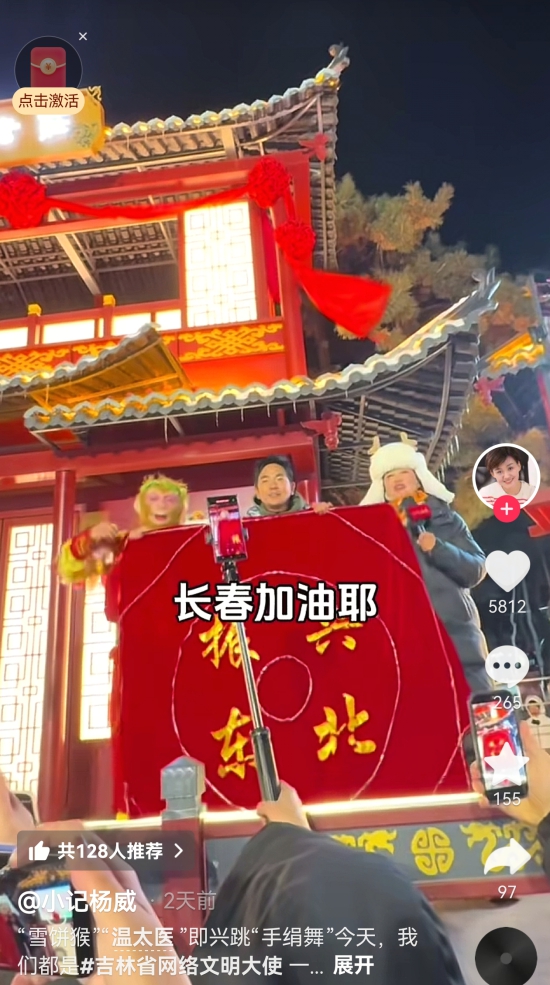 在长春动植物园,“雪饼猴”与“温太医”跨界互动,耍起东北手绢,这一充满喜感与文化碰撞的场景迅速成为爆款,展现了吉林文旅的创意与亲和力。