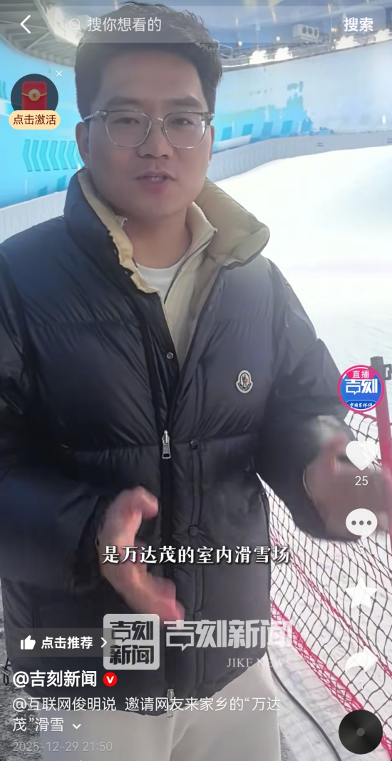 在万达茂室内滑雪场,950万粉丝博主@互联网俊明说,邀请网友来家乡的“万达茂”滑雪。