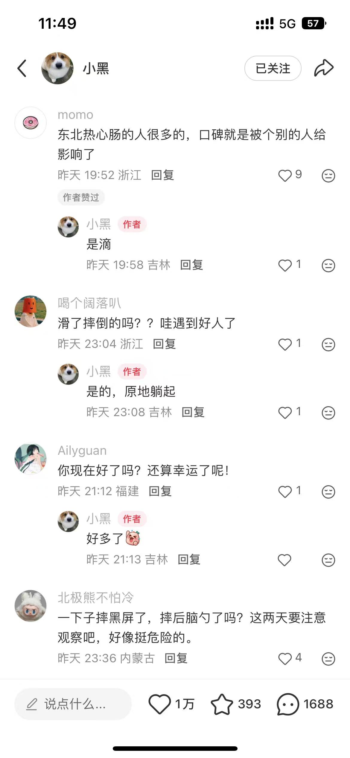网友们既为“夏。”的善举点赞,也牵挂着小黑的伤势。“你现在好了吗?一定要好好休息”“注意观察吧?”,一声声问候穿过屏幕,传递着素不相识却真挚的关怀。“小黑”随后回复说,头与尾骨还有些疼,但已无大碍,让大家放心。