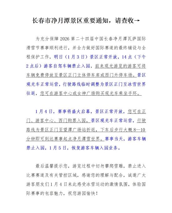 1月4日,第二十四届中国长春净月潭瓦萨国际滑雪节将启幕,为确保赛事顺利进行,景区发布交通调整通知,提醒广大游客合理规划行程。
