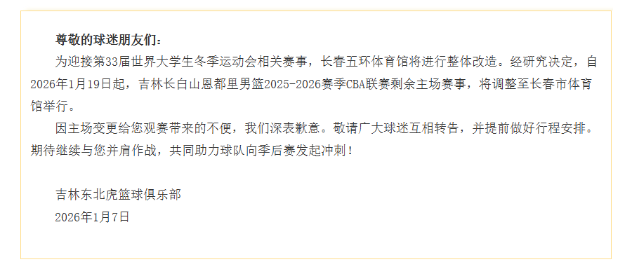 1月7日,吉林东北虎男篮俱乐部发布公告,为迎接第33届世界大学生冬季运动会相关赛事,长春五环体育馆将进行整体改造。经研究决定,自2026年1月19日起,吉林长白山恩都里男篮2025-2026赛季CBA联赛剩余主场赛事,将调整至长春市体育馆举行。