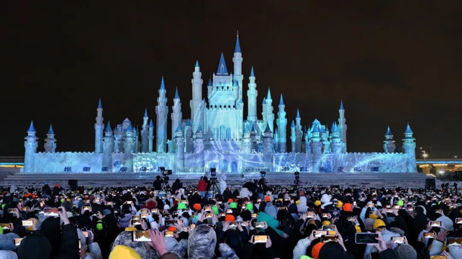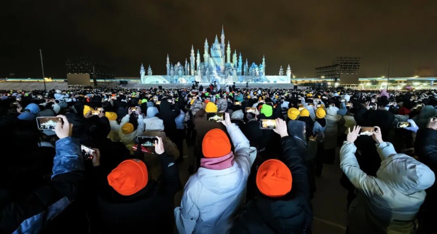 高达40米的冰雪城堡结合3D Mapping技术上演超级光影秀。声明:图片未经授权禁止转载使用。