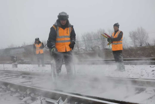 “滑床板、转辙机杆件是扫雪的关键,一点残留的冰碴,都有可能影响道岔转换,造成耽误列车。”梅河口站运转车间主任陈志慧不时地提醒除雪队员。本轮降雪正值三九天,气温很低,这个段干部职工不惧严寒和风雪,迎难而上,坚定“雪不停、人不撤”的信念,对所辖道岔、客车径路等关键部位进行不间断除雪,除雪队员用喷灯烤细小冰碴,用风力除雪机吹雪,用扫帚清扫道岔积雪,用雪铲清理挤压的雪块,确保道岔运用正常。