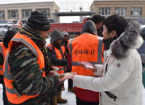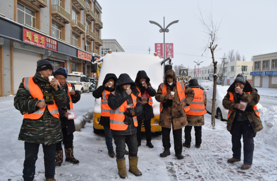 清雪一线延伸至哪里,暖心关怀便跟进到哪里。镇政府精心筛选镇区部分沿街商户,设立“环卫工人小憩加油站”,并筹备姜茶等物资;镇妇联提前对接区妇联申请防寒物资,区妇联快速统筹调配暖心暖贴,全方位保障一线作业人员的工作条件与身体健康。此外,镇工会、妇联、城乡建设服务科、执法中队联合组建“暖心服务队”,走上街头为冒寒作业的环卫工人递上热水、贴上暖宝宝,让坚守一线的劳动者在严寒中感受到组织的关怀与冬日暖意。