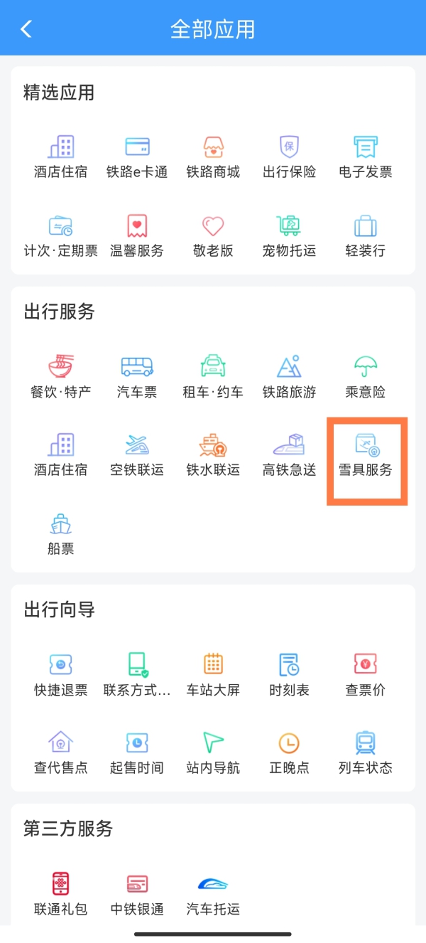 首先,找到12306首页的应用列表区域,滑动进入全部应用,在出行服务里找到雪具服务;