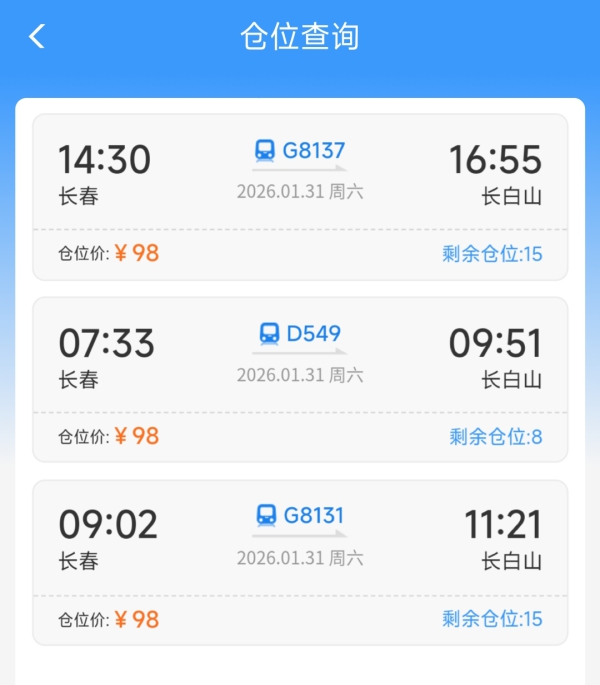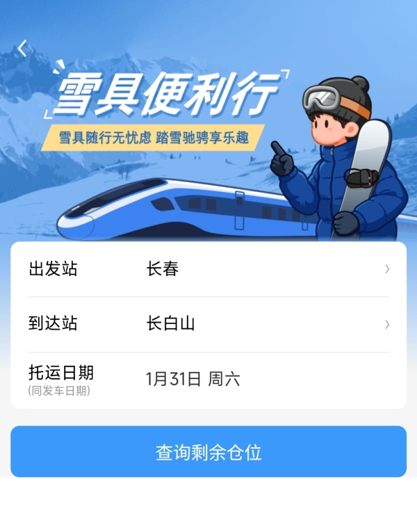 “要带孩子去长白山滑雪,现在有雪具便利行的试点列车了,能实现雪具随行,比较节省时间。但听说每趟列车都有仓位限制,能在订票前知道哪趟列车还能预约服务吗?”