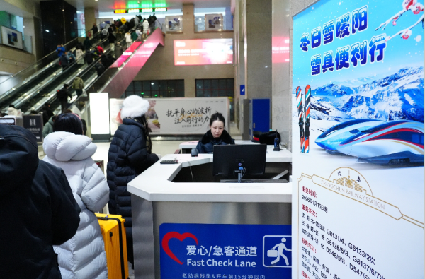 乘车当日,乘客携带雪具通过“雪具便利行”专属通道安检,核验后粘贴“雪具便利行”标识。