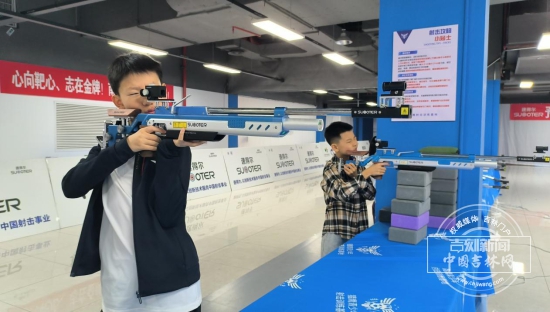 在电子射击场,一个个孩子端着激光模拟射击训练枪瞄准电子靶,屏息凝神,十分专注。托管教师则在一旁帮助他调整姿势。