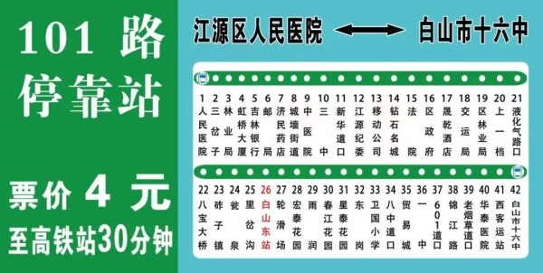 中国吉林网、吉刻新闻记者了解到,白山101路城际公交车,主要往返江源区人民医院和白山市十六中,途经白山高铁站,全线共42站,采取阶梯票价收费,车费2-4元。