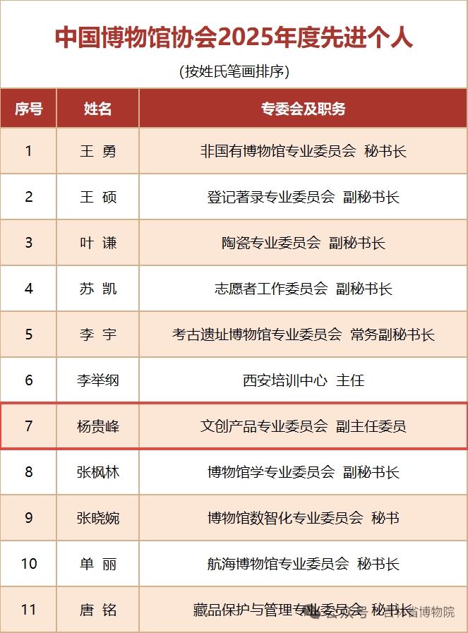 中国博物馆协会第八届理事会第二次会议日前在京召开,会议推选出10个中国博物馆协会2025年度先进集体及11名先进个人。吉林省博物院后勤服务中心主任杨贵峰荣获中国博协2025年度先进个人。