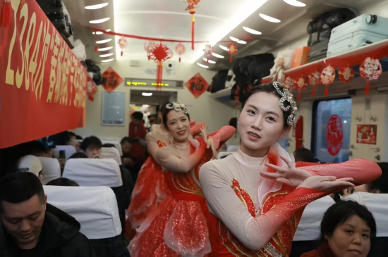 “各位旅客,今天是农历小年,我们在这趟开往春天的列车上,先给大家拜个早年!”列车长张永斌的开场白伴随着掌声响起。列车穿过银装素裹的松辽平原,而车厢内的《幸福中国一起走》舞蹈已经热情开场。列车员身着制服,在有限空间里编排的舞蹈动作整齐划一,她们的微笑与车窗上凝结的冰花相映成趣。