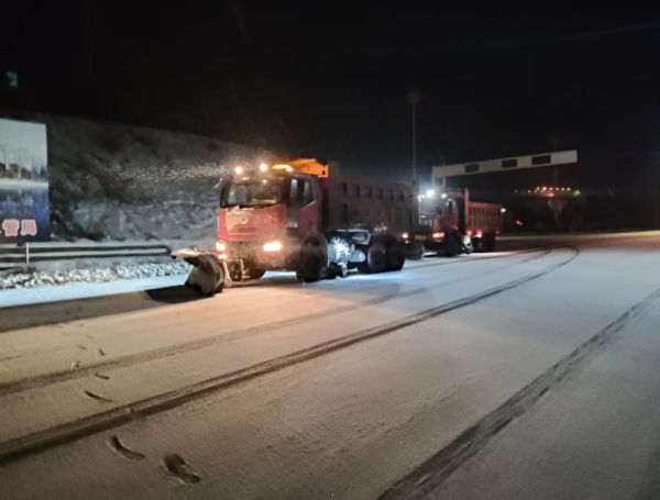 除雪车梯队作业,缓慢行驶。气温依旧很低,作业人员顶着严寒,驾驶除雪设备推雪前行,逐渐露出路面。作业同时,养护人员随时注意来往车辆,保证通行安全。坡陡弯急等重点路段人工作业也在同步开展,除冰湖、维护设施、清理垃圾,冰水混合,打湿了鞋面、裤脚。