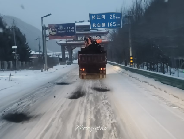 撒布车缓缓驶出,他们目的地是G504国道的重点路段,此路段坡陡弯急,是防滑作业的重中之重。为保证布料均匀,每辆洒布车后斗都配备3名养护工人,随着指令下达,撒布车展开作业,防滑料均匀地铺洒在路面上,形成一层灰色保护层,与黑色的路面、白色的积雪构成鲜明的色彩对比。