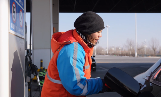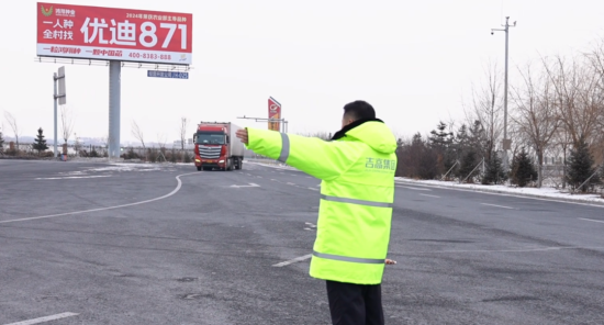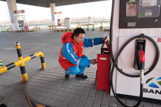 服务区迎来加油高峰期。加油机前车辆排起了队,工作人员主动上前,一边引导车辆有序停放,一边帮司机提枪加油,加油完毕还要提醒一句:“新年快乐!上路慢点开,注意安全。”简单的话语让寒冷的冬日多了一份暖意。