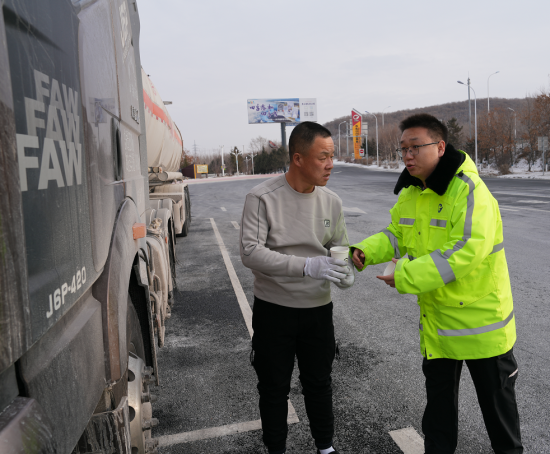志愿者们来到停车区域。他们捧着提前熬好的姜茶,递给司乘人员,并为有需要的司机免费提供热水、应急药品、路线咨询等服务。一杯温热的姜茶,一句贴心的叮嘱,化解了旅途的奔波与寒冷,传递着交通人的善意。