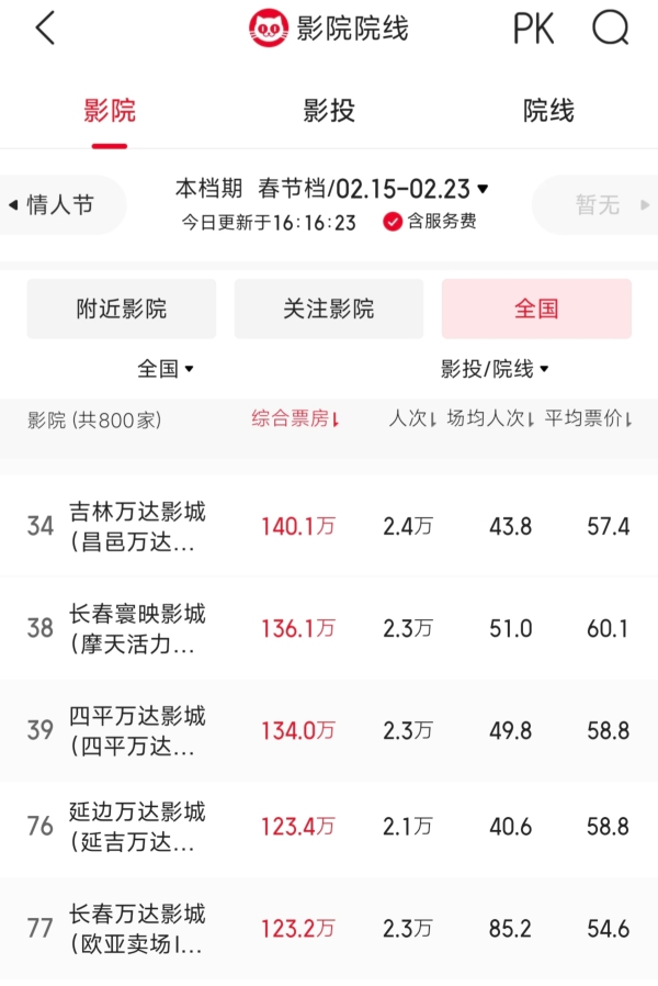 吉林影院运营成效显著,全省共有5家影城闯入全国票房百强榜单,展现强劲区域竞争力。其中,吉林万达影城(昌邑万达广场IMAX店)以140万元票房位列全国第34名;长春寰映影城(摩天活力城IMAX店)136万元位列第38名;四平万达影城(四平万达广场IMAX店)134万元位列第39名;延边万达影城(延吉万达广场IMAX店)、长春万达影城(欧亚卖场IMAX店)均以123万元分列第76、77名。