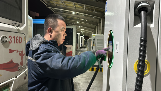室外气温低至零下二十摄氏度,能源管理部黄炎正在为车辆进行夜间充电,每日晚间23:00至凌晨5:00,他所在的充电班组需完成86台公交车夜间充电工作。今年春节正值他们班组值班,当问及他不能陪家人过节怎么想时,他却说:“保证第二天车辆顺利出车,再回家过节也不迟。”