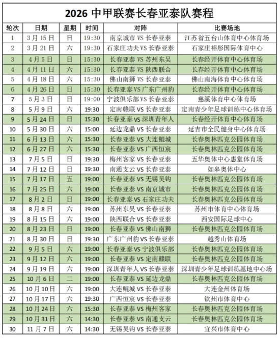 3月2日,中国吉林网、吉刻新闻记者获悉,2026赛季中甲联赛赛程出炉!长春亚泰新赛季首秀将于3月15日19时30分在江苏省五台山体育中心体育场上演,对手是南京城市。