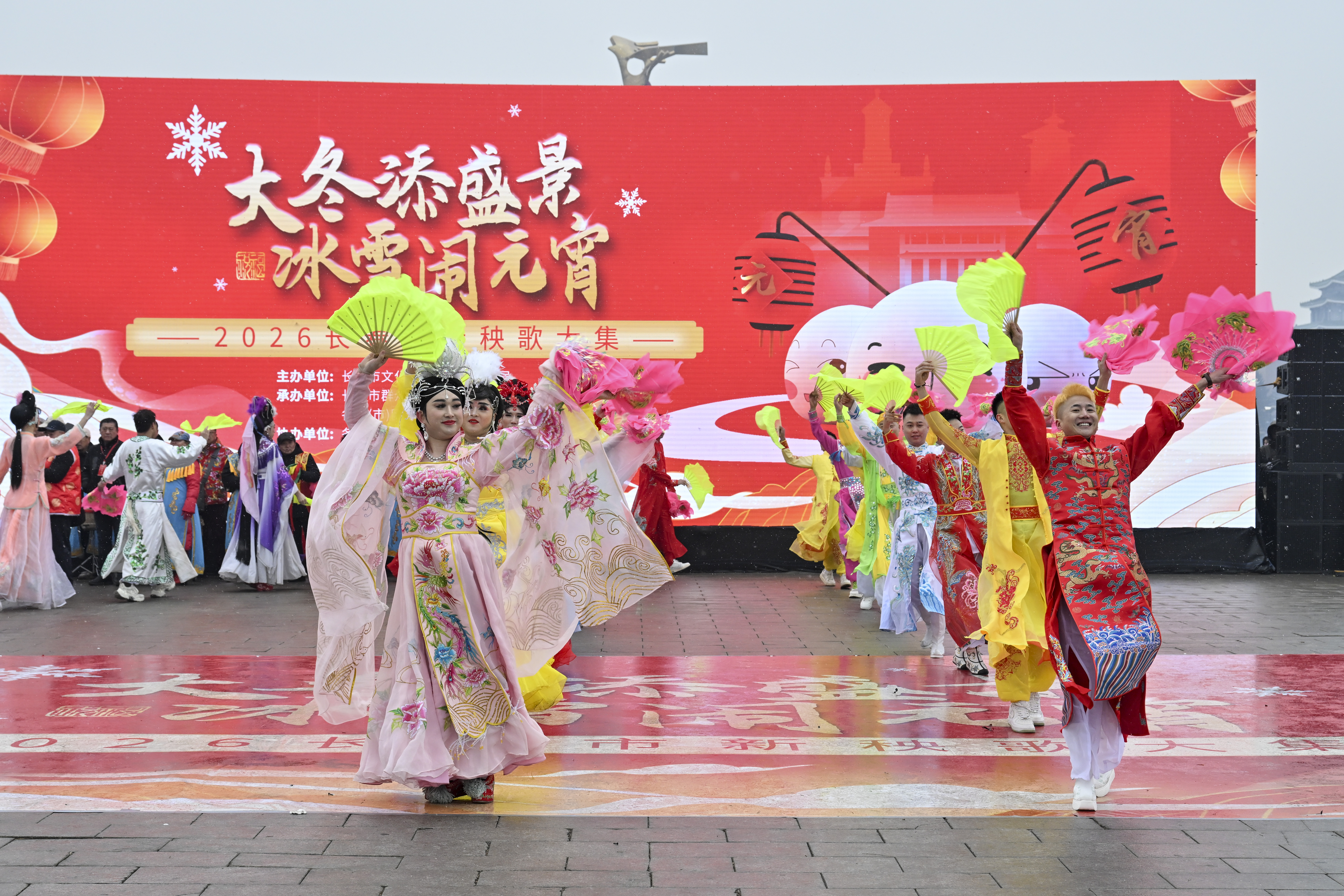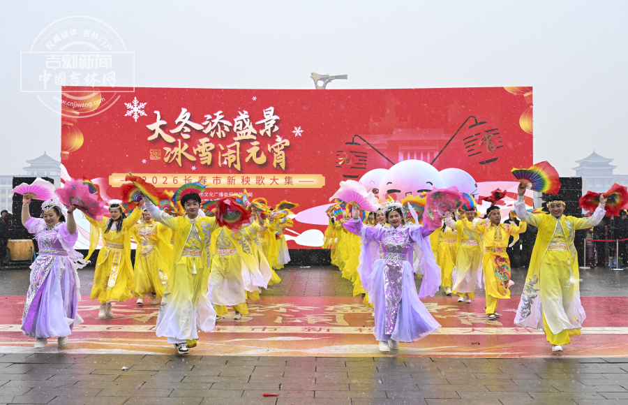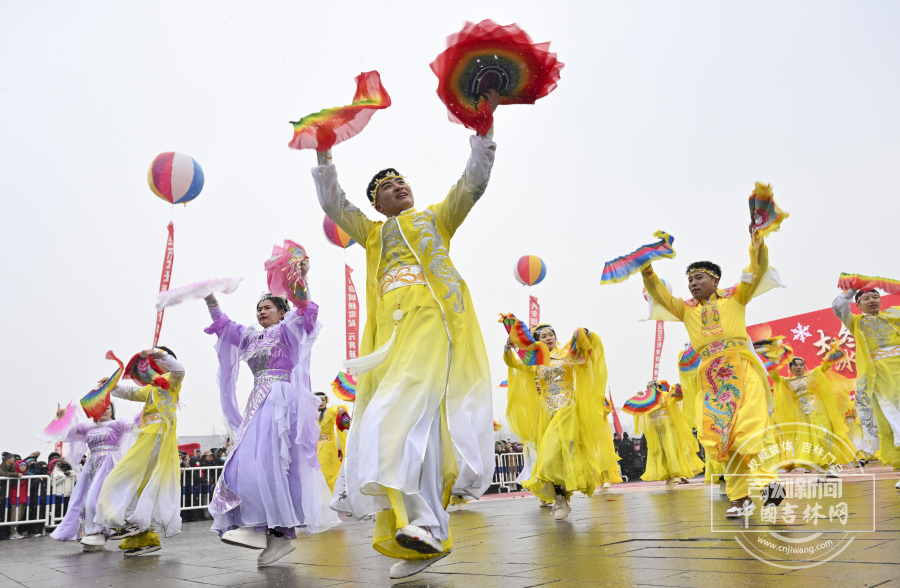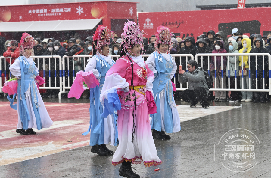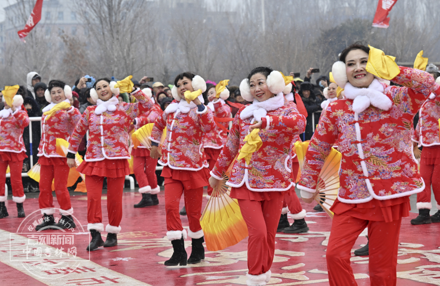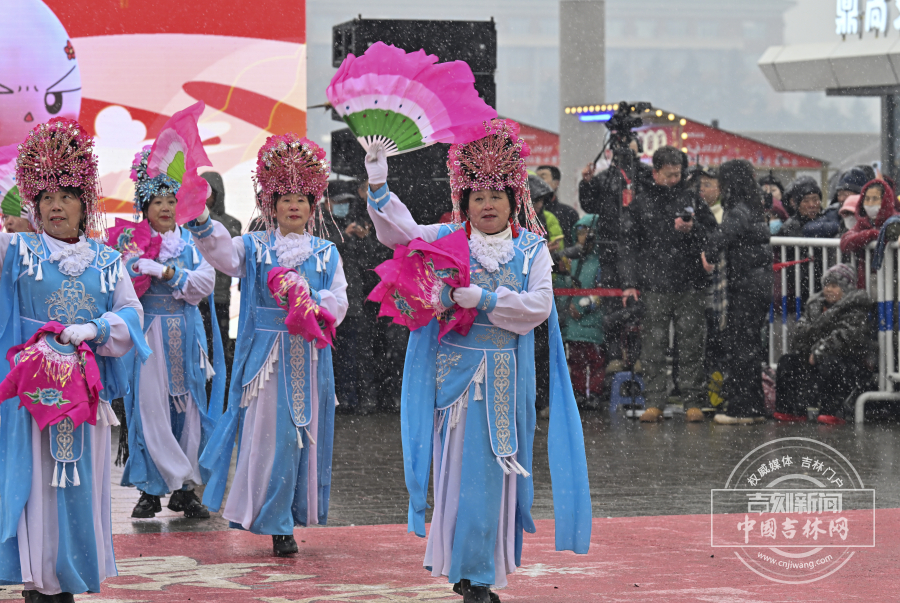 漫天飞雪中,彩扇翻飞、彩绸舞动,尽显东北元宵节的独特年味。