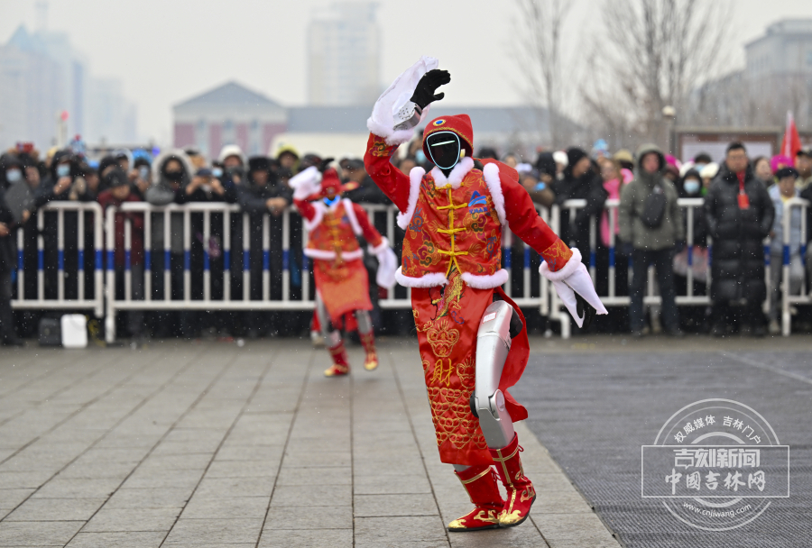 身着红装的人形机器人与舞蹈演员一同献上舞蹈,与市民共庆佳节。
