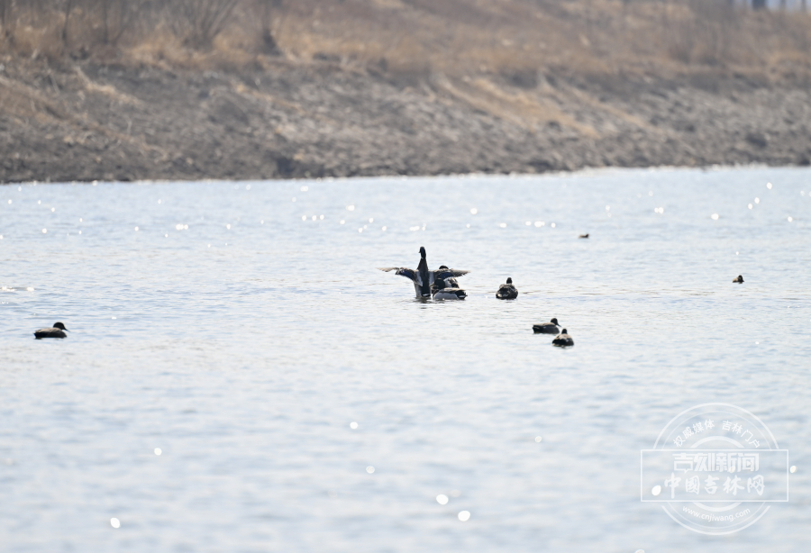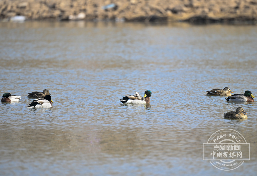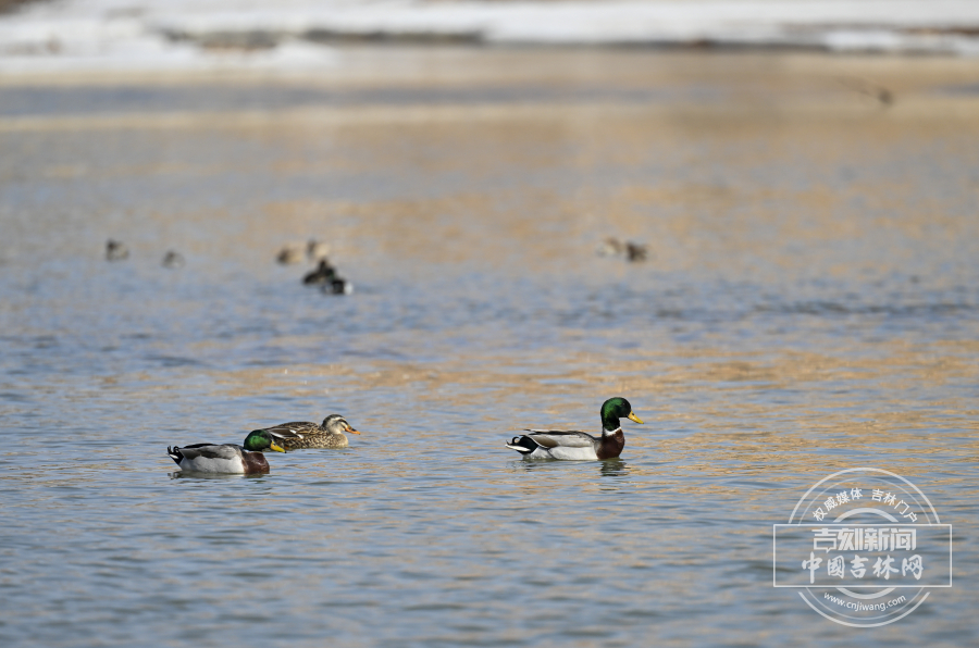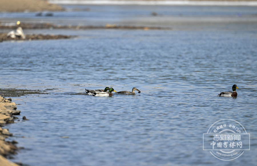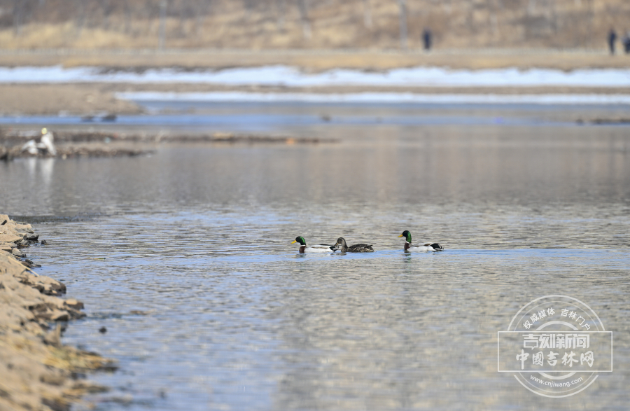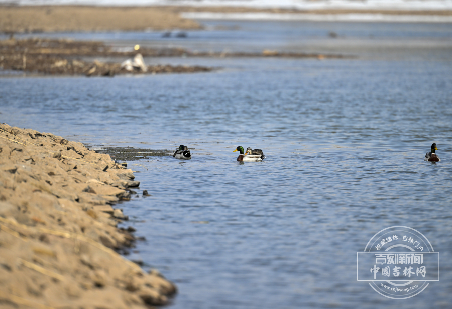 近日,长春天气转暖,伊通河冰消雪融,迎来野鸭在此休憩觅食。