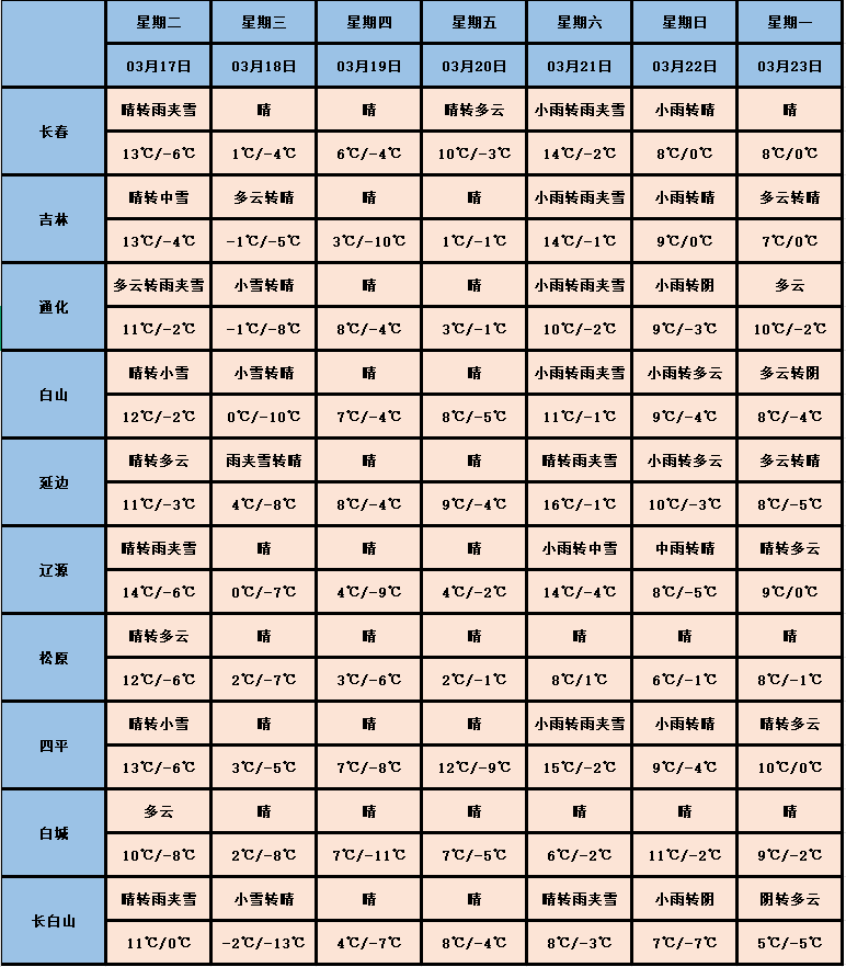21—22日,松原东北部(扶余),长春北部(榆树、农安),辽源,吉林,通化, 白山,延边,长白山保护开发区有小雨或雨夹雪转小雪。