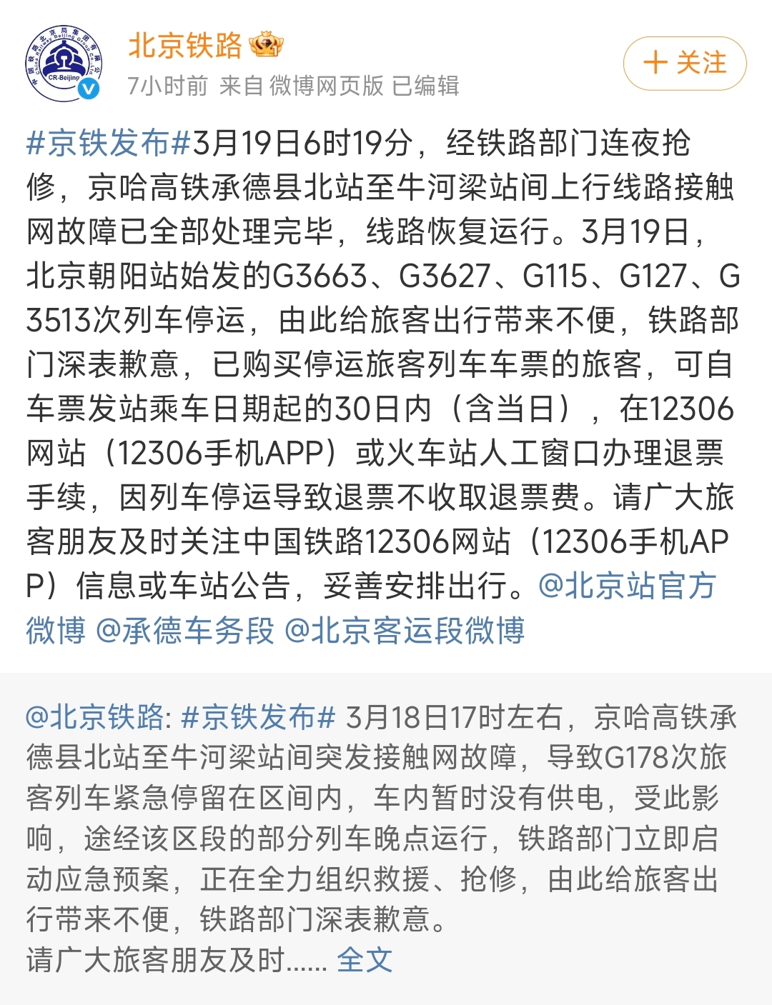 3月19日,@北京铁路发布微博,3月19日6时19分,经铁路部门连夜抢修,京哈高铁承德县北站至牛河梁站间上行线路接触网故障已全部处理完毕,线路恢复运行。3月19日,北京朝阳站始发的G3663、G3627、G115、G127、G3513次列车停运,由此给旅客出行带来不便,铁路部门深表歉意,已购买停运旅客列车车票的旅客,可自车票发站乘车日期起的30日内(含当日),在12306网站(12306手机APP)或火车站人工窗口办理退票手续,因列车停运导致退票不收取退票费。请广大旅客朋友及时关注中国铁路12306网站(12306手机APP)信息或车站公告,妥善安排出行。