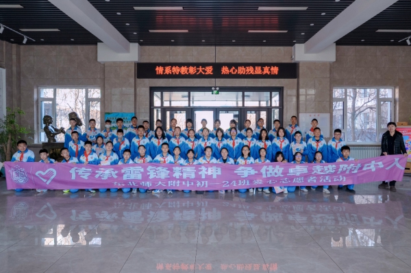 为深入开展学雷锋志愿服务活动,引导青少年传递爱心、践行担当,3 月 27 日,东北师范大学附属中学初一・24 班全体同学在班主任闫萍老师带领下,走进长春市特殊教育学校,开展 “三月春风暖,一起学雷锋”主题慰问活动,用青春行动传承雷锋精神,用真诚关爱温暖特殊儿童,充分展现了新时代青少年向善向上、勇担使命的良好风貌。