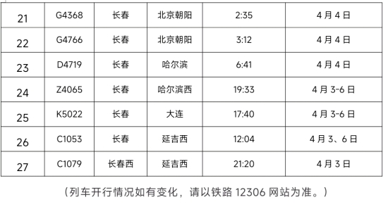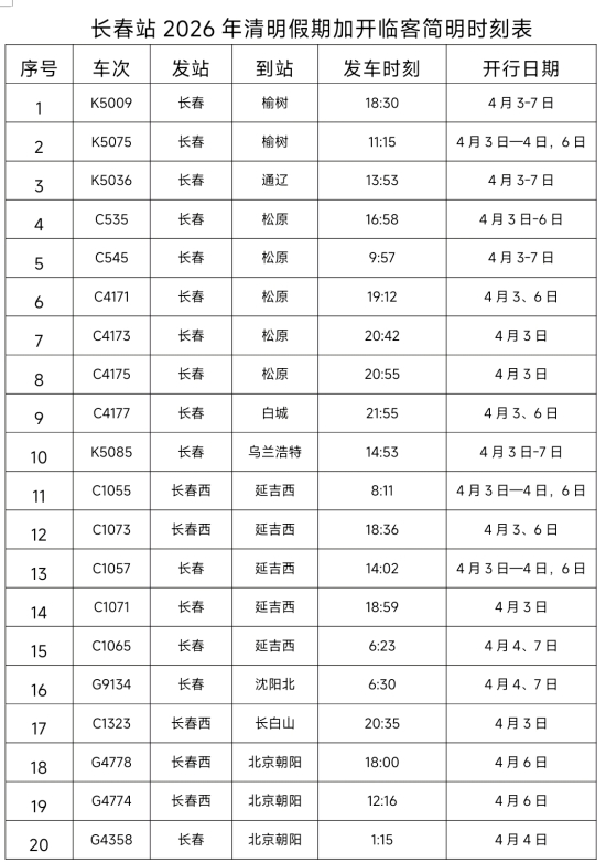 今年清明假期客流以中短途客流为主,重点集中在松原、榆树、延吉、北京等热门出行方向。长春站精准研判客流变化,严格落实“一日一图”调度机制,科学有序推进运力投放工作。为全力保障旅客出行需求,车站计划加开松原、延吉西、榆树、北京朝阳等方向始发临时旅客列车27列,全面做好运力准备,确保高峰时段运能充足、出行顺畅。