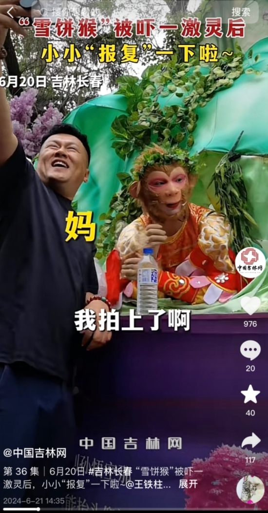 王铁柱更广为人知的名字是“雪饼猴”,每天在长春动植物公园趴在“五行山”下,用幽默的语言接游客,圈粉百万,成了长春文旅的招牌。