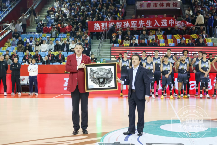 随后,长白山旅游股份有限公司董事长王昆献上匠心铁铸作品“虎啸山林”,寓意虎啸篮坛、传奇永续;长春市体育局局长高继峰送上鲜花,致敬他在这块场地上创造的70分纪录;吉林省体育局局长牟大鹏赠予“虎王”荣耀铜像,基座刻有“吉林骄傲 城市英雄”字样。牟局长现场表示,孙军不仅是吉林体育的骄傲,更是中国篮球的功勋。