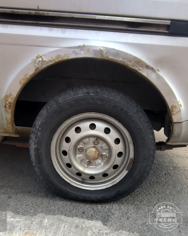 长春清和街与德惠路交会处,一辆核载8人的面包车四个车轮均已塌陷