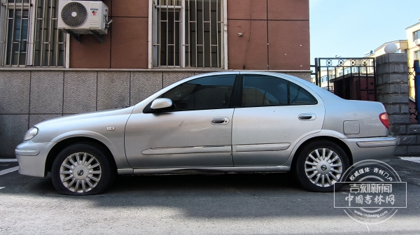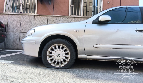长春市康寿胡同,一辆轿车车胎已瘪,轮毂泛黄积灰