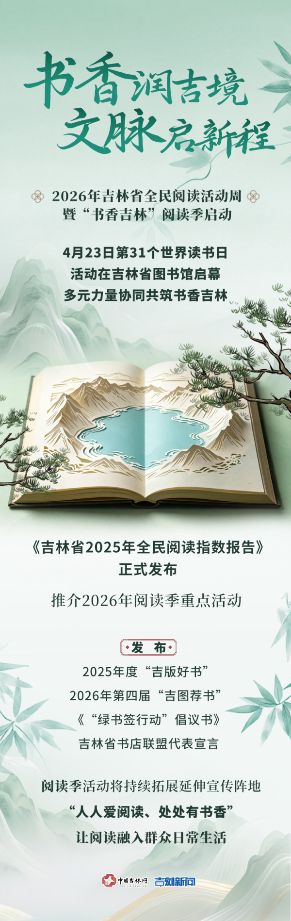 启动仪式上,将正式发布《吉林省2025年全民阅读指数报告》,全景呈现吉林省全民阅读工作的丰硕成果;同时发布2026年“书香吉林”阅读季重点活动、2025年度“吉版好书”推荐、第四届“吉图荐书”书目,全方位营造全民阅读的浓厚氛围。同时发布《“绿书签行动”倡议书》和吉林省书店联盟代表宣言,为全省文化产业高质量发展明确方向。