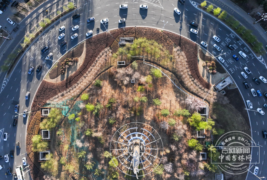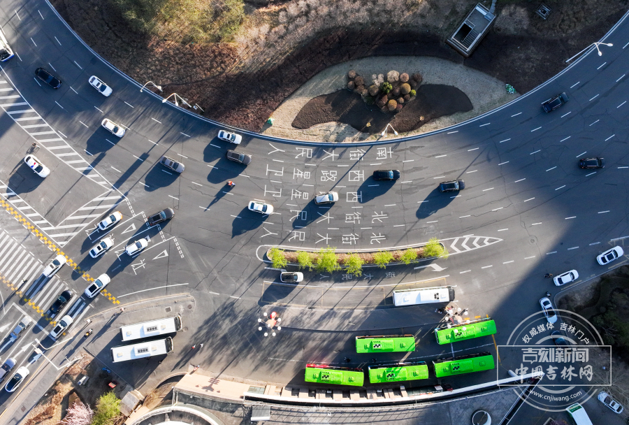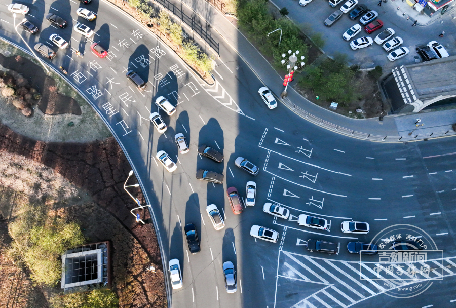 4月22日晚高峰时段,航拍采用“螺纹式”交通标线的长春卫星广场,车辆沿标线有序通行,整体车流衔接顺畅。