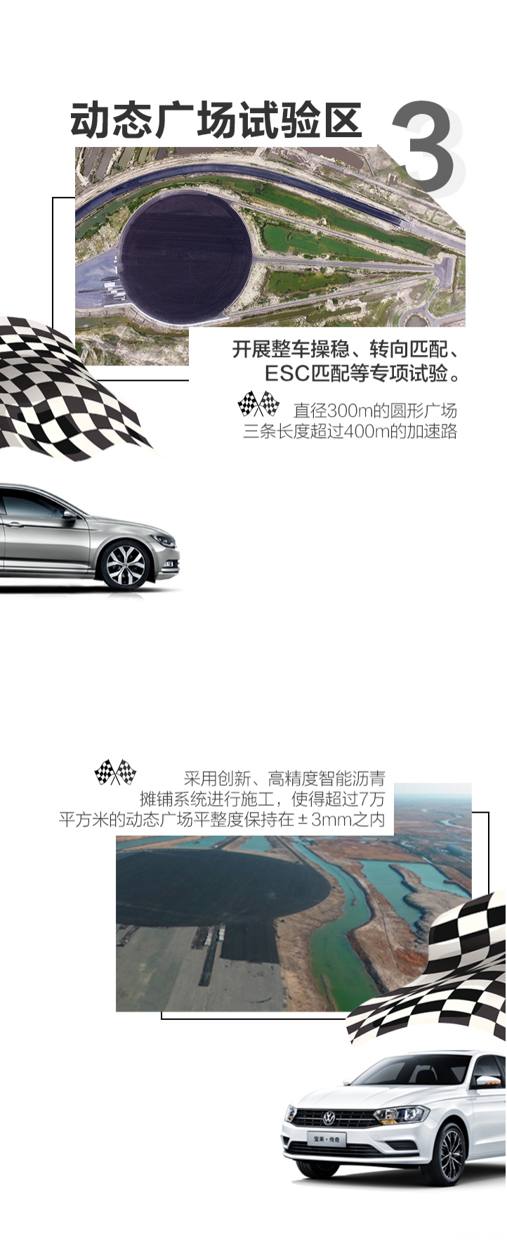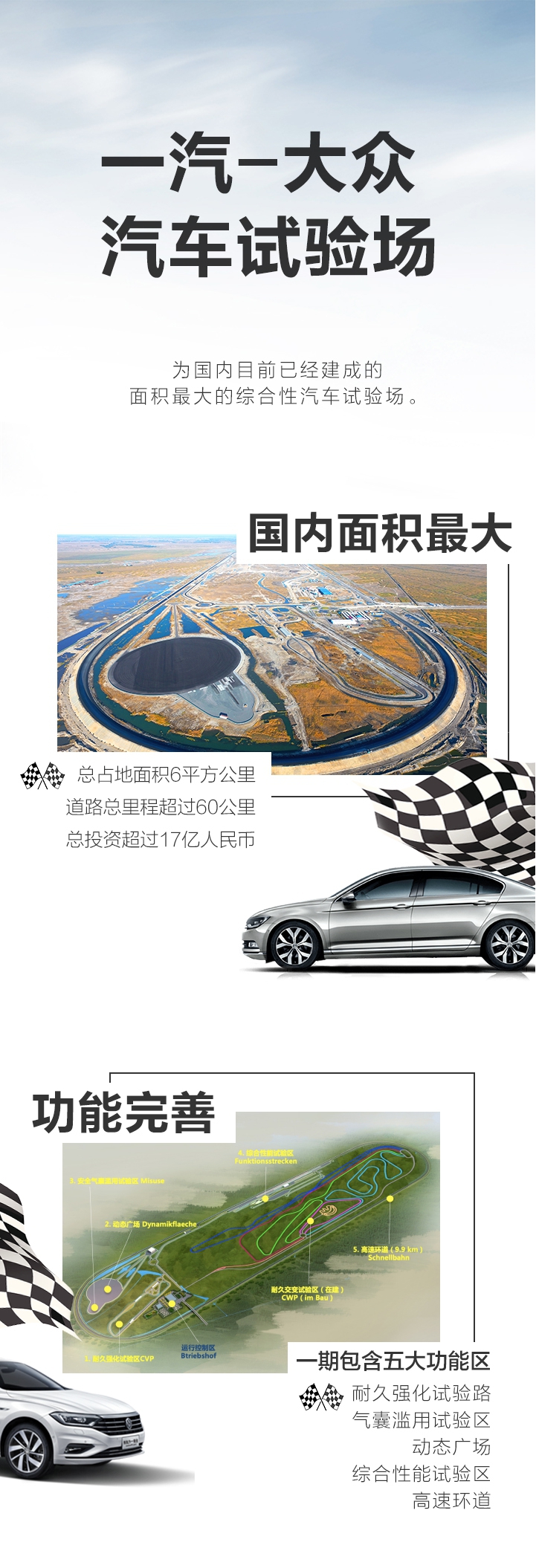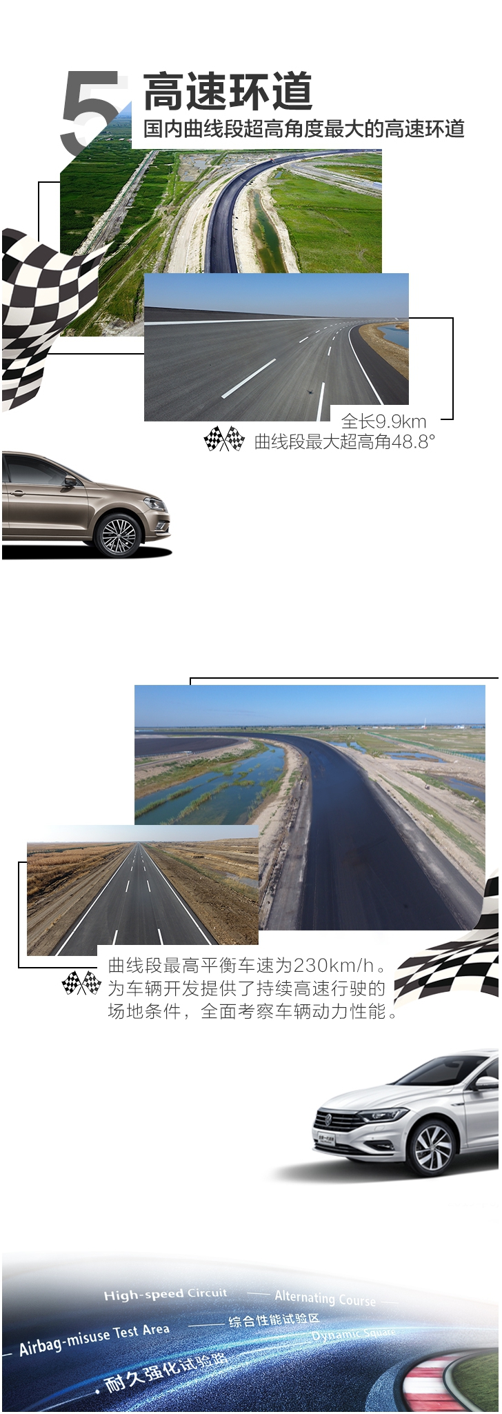 具体而言,在一汽-大众汽车试验场一期的五大核心功能区中,耐久强化实验区道路总长达2.1公里,设有15种符合中国路况的典型路段,可针对产品进行8000公里整车耐久强化试验,相当于用户在公开路面行驶30万公里;气囊误作用实验区模拟96种恶劣工况,专项考察气囊点爆策略;动态广场试验区拥有三条长度超过400米的加速路直通直径达300米的圆形广场,能够有效针对车辆操控性能、转向匹配、ESC等电子模块工作进行专项验证;综合性能试验区总面积达10万平方米,结合中国地貌筛选出26种极具代表性的特殊实验路段,针对车辆综合行驶性能指标进行验证测试;高速环道全长9.9公里,曲线段最大超高角达48.8°,采用全球仅有的两台无纵缝桥式摊铺机进行曲面摊铺,在高难度施工条件下以高质量的精度奠定高速环道验证测试的基础。