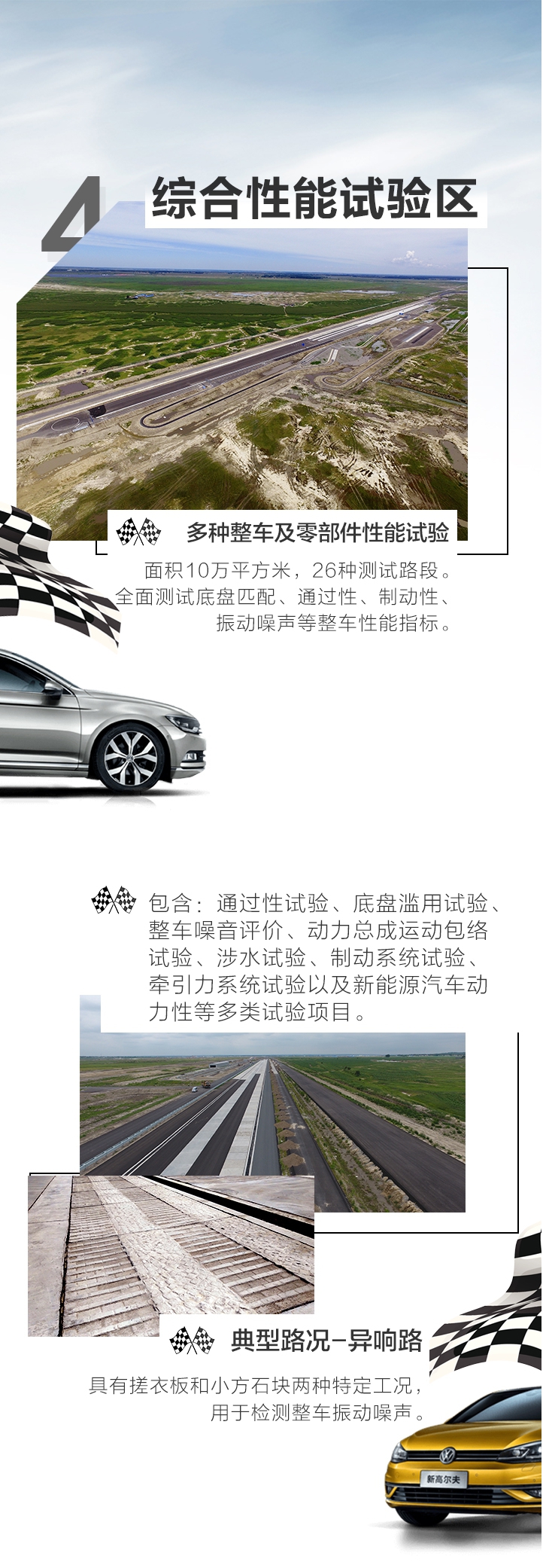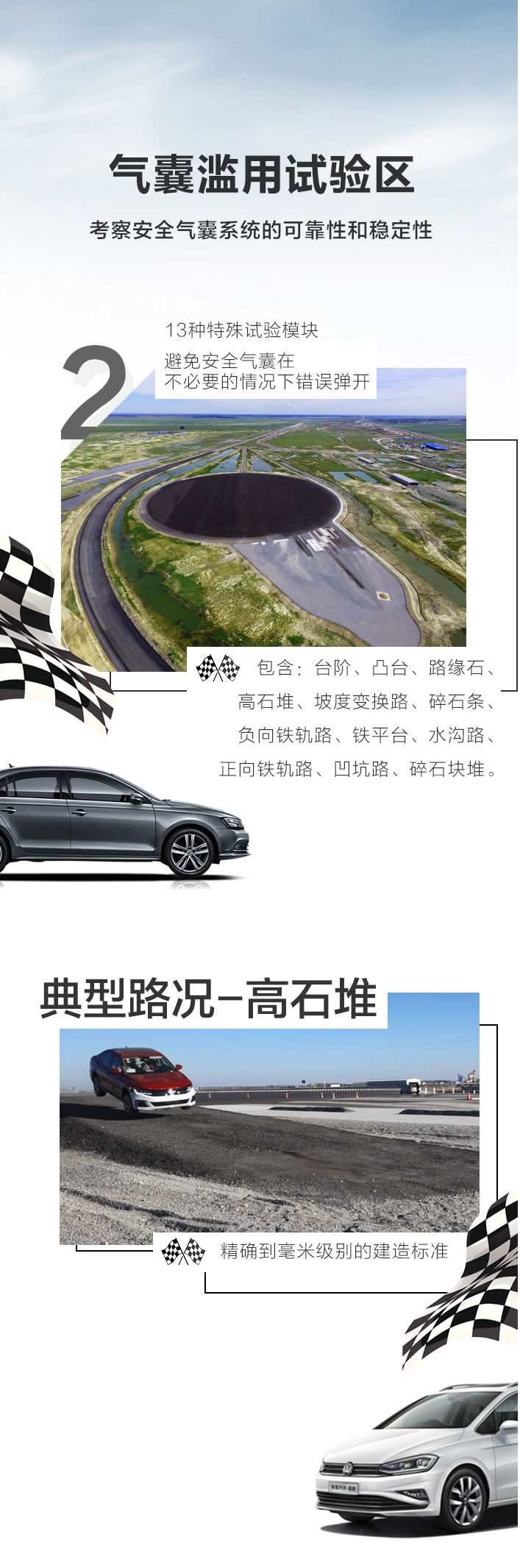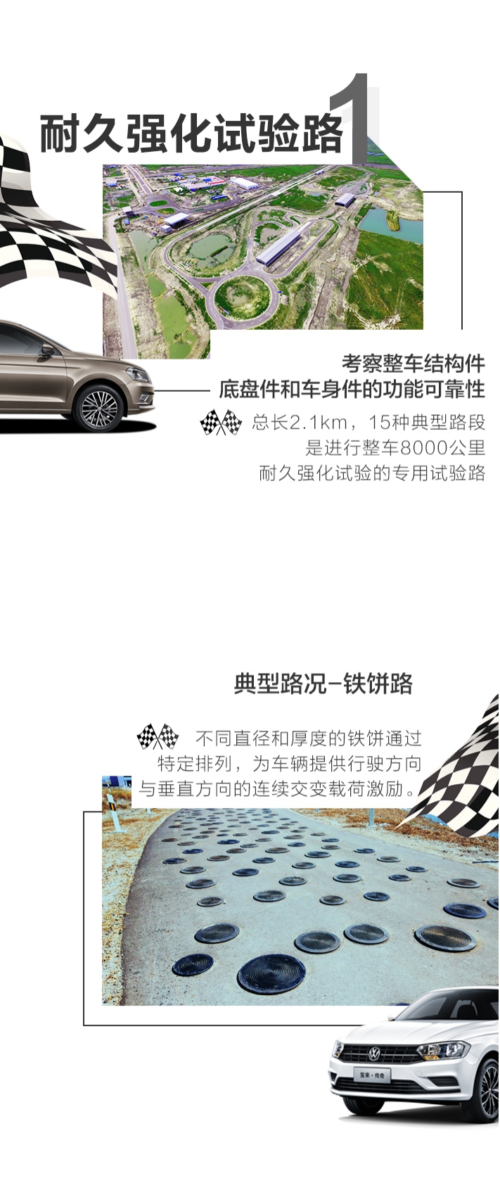 具体而言,在一汽-大众汽车试验场一期的五大核心功能区中,耐久强化实验区道路总长达2.1公里,设有15种符合中国路况的典型路段,可针对产品进行8000公里整车耐久强化试验,相当于用户在公开路面行驶30万公里;气囊误作用实验区模拟96种恶劣工况,专项考察气囊点爆策略;动态广场试验区拥有三条长度超过400米的加速路直通直径达300米的圆形广场,能够有效针对车辆操控性能、转向匹配、ESC等电子模块工作进行专项验证;综合性能试验区总面积达10万平方米,结合中国地貌筛选出26种极具代表性的特殊实验路段,针对车辆综合行驶性能指标进行验证测试;高速环道全长9.9公里,曲线段最大超高角达48.8°,采用全球仅有的两台无纵缝桥式摊铺机进行曲面摊铺,在高难度施工条件下以高质量的精度奠定高速环道验证测试的基础。