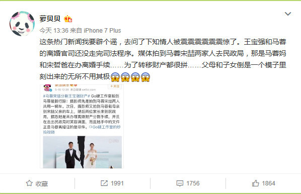 可令大家万万没想到的是,“彩蛋”还在后面,神转折来了! 下午一点半左右,媒体人“萝贝贝”在微博中爆料称,从知情人士处得知,此番马蓉、宋喆以及双方父母被拍到出入民政局,不是马蓉和王宝强办理离婚手续。而是马蓉母亲和宋喆父亲办理离婚手续,马蓉和王宝强还没有离婚。 萝贝贝还表示“为了转移财产都很拼,父母和子女都是一个模子里刻出来的无所不用其极。”疑似暗指马蓉和宋喆为了转移王宝强财产安排双方父母结婚再离婚。 此条微博很快被转发过千次,但也无法真正得到核实。