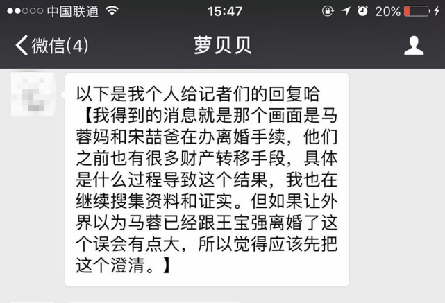 为此腾讯娱乐第一时间联系爆料人萝贝贝,其表示:“我得到的消息就是那个画面是马蓉妈和宋喆爸在办离婚手续,他们之前也有很多财产转移手段,具体是什么过程导致这个结果,我也在继续搜集资料和证实。但如果让外界以为马蓉已经跟王宝强离婚了这个误会有点大,所以觉得应该先把这个澄清。”