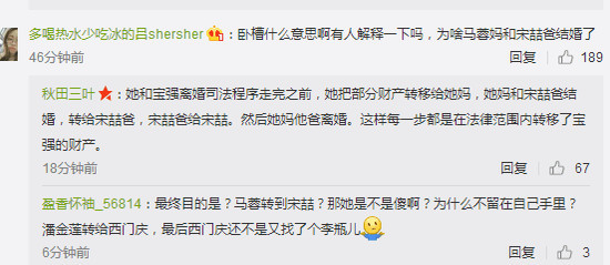 这个爆料就有点震碎三观了,普通群众的脑袋瓜可能有点绕不过来,但有聪明的网友指出:如果马蓉父母离婚,宋喆父母离婚,然后马蓉母亲和宋喆父亲结婚,这样马蓉就可以把转移的财产先给母亲,马蓉母亲再通过婚内财产再给宋喆父亲,马蓉母亲和宋喆父亲离婚后,宋喆父亲把财产转给宋喆,这样马蓉和宋喆结婚后,就完成了财产的乾坤大挪移。只能说,为了转移财产,马宋两家这也太拼搏了吧?!这是得把《离婚法》吃得多透才能掌握的“才学”啊。